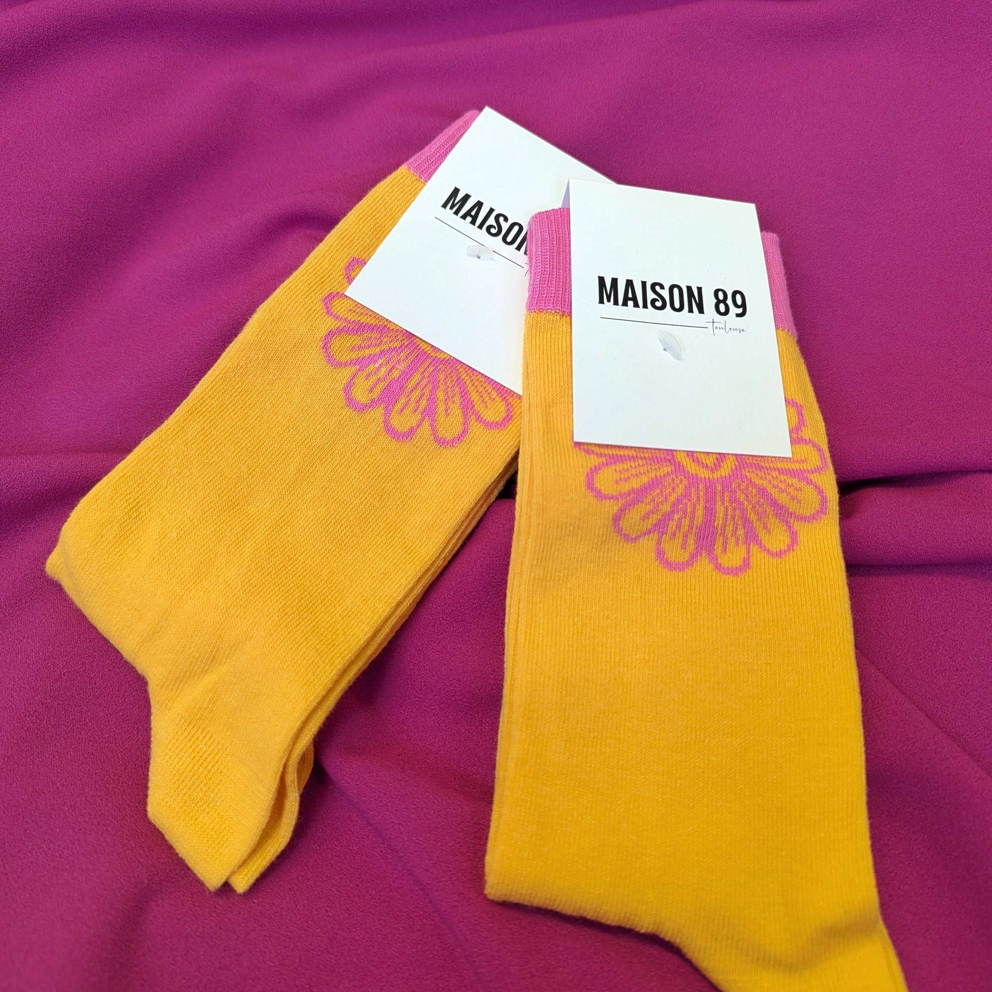 Affirmez votre style avec nos chaussettes Maison 89 en exclusivité pour notre première Collection. Ce modèle jaune est sublimé par notre fleur rose.